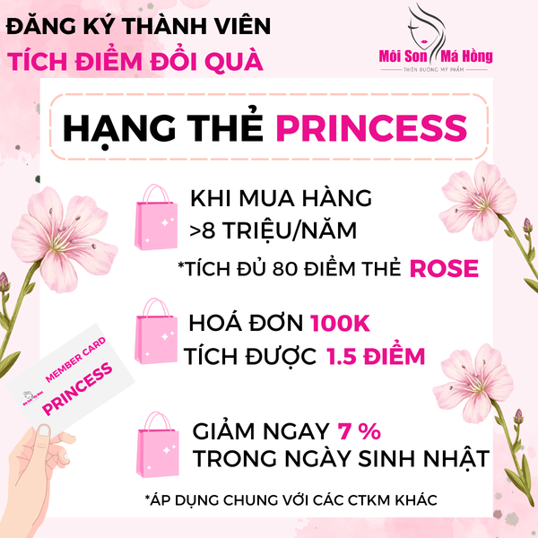 - Quy định sử dụng điểm để mua sắm tại Môi Son Má Hồng (offline/online) chỉ áp dụng cho hạng thẻ Rose khi chi tiêu đủ 1.000.000 VNĐ (tương đương 10 điểm) và không quy định điểm đối với hạng thẻ Princess và Queen