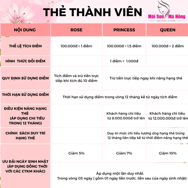 - Có 3 mốc tích điểm tương đương với 3 thứ hạng thẻ cao dần: ROSE, PRINCESS, QUEEN, cấp độ càng cao sẽ càng nhận được nhiều ưu đãi hấp dẫn và thú vị nhé.