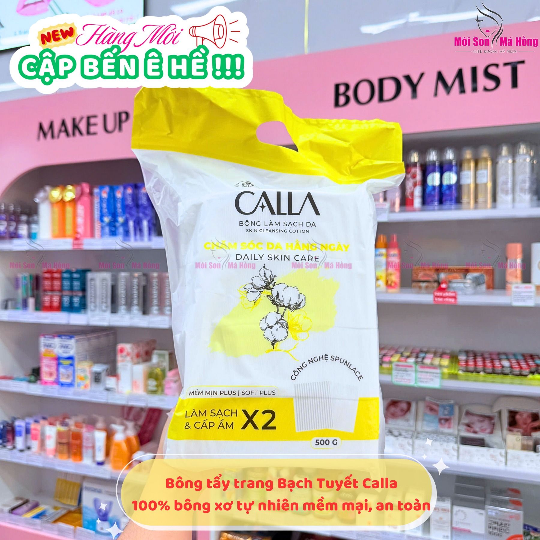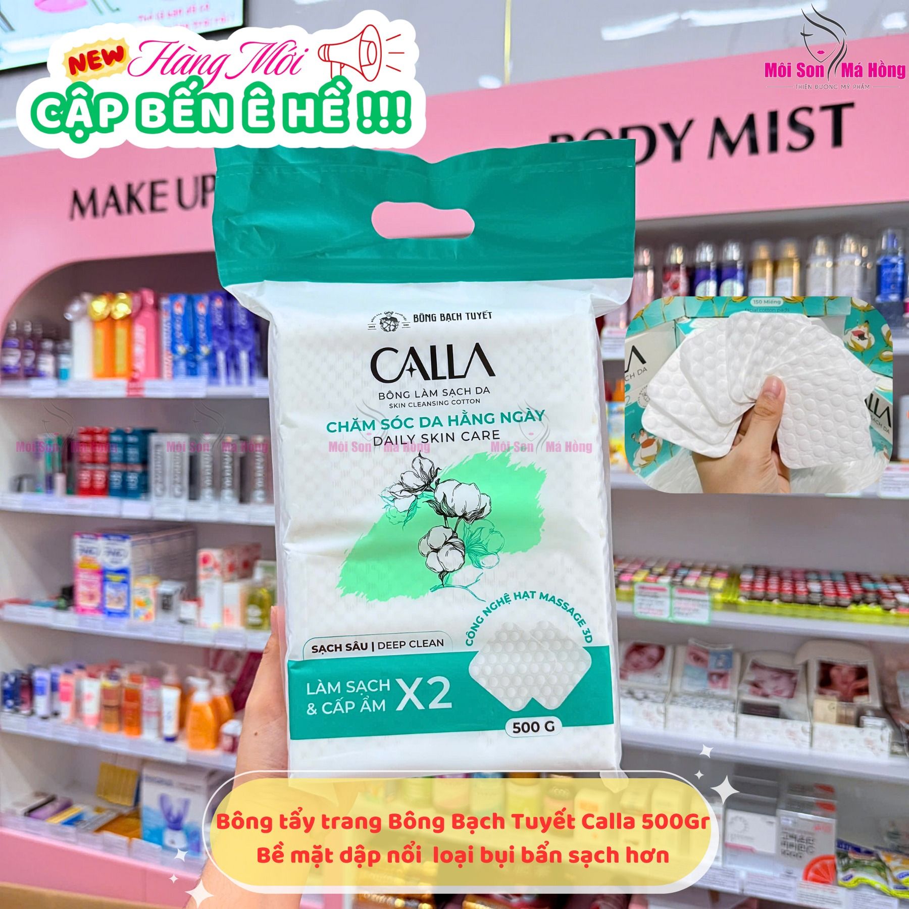 Bông Tẩy Trang Calla Skin Cleansing Cotton 3D Round (Tròn 3D) Nguyên Liệu 100% Bông Xơ Thiên Nhiên: Sử dụng bông xơ thiên nhiên nhập khẩu từ Mỹ, mang lại độ mềm mại và dịu nhẹ cho da.