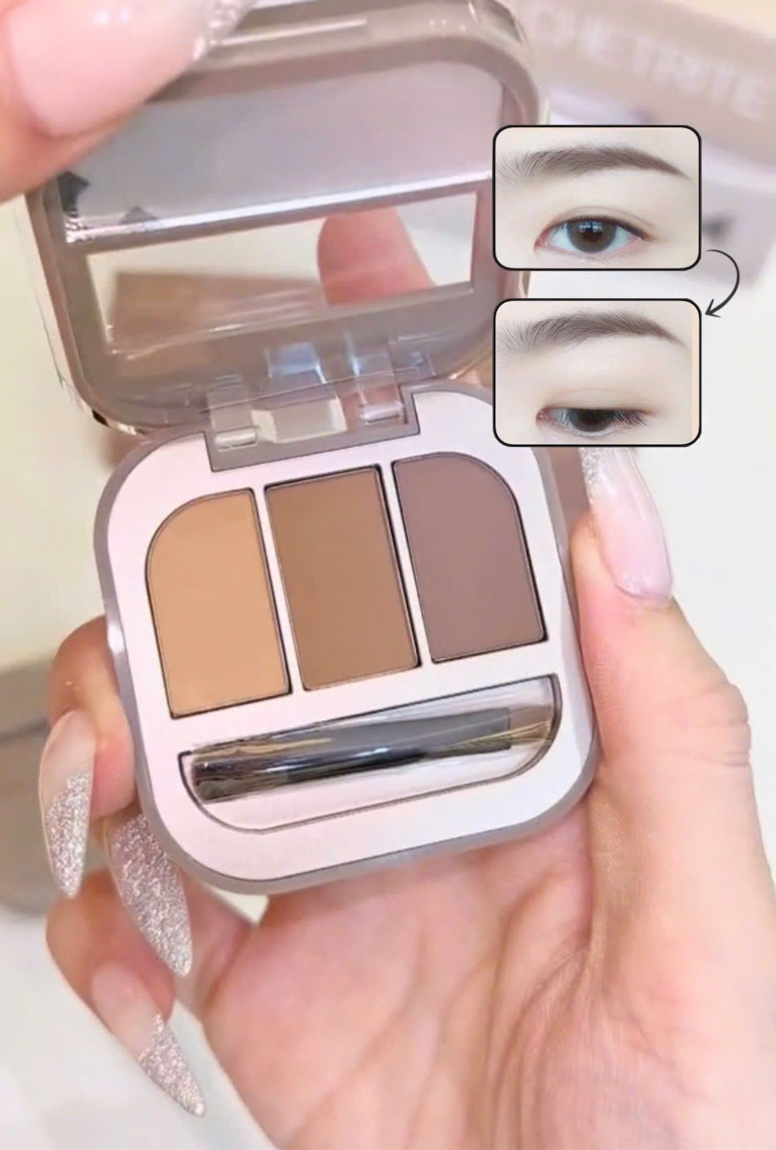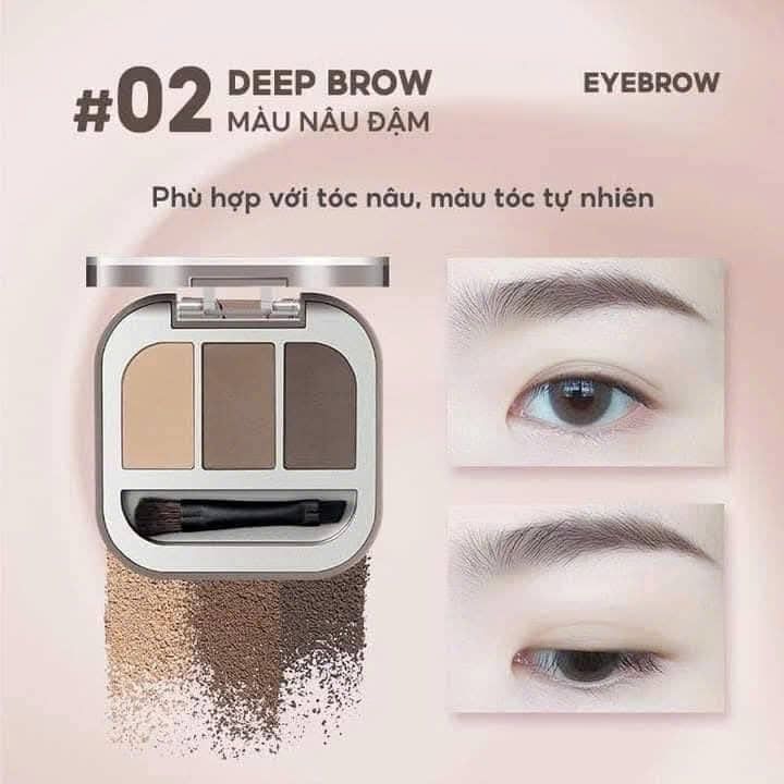 - Chứa 3 ô màu: Nâu nhạt, Nâu trung và Nâu đậm, giúp bạn dễ dàng phối hợp và tạo ra đôi lông mày hoàn hảo.