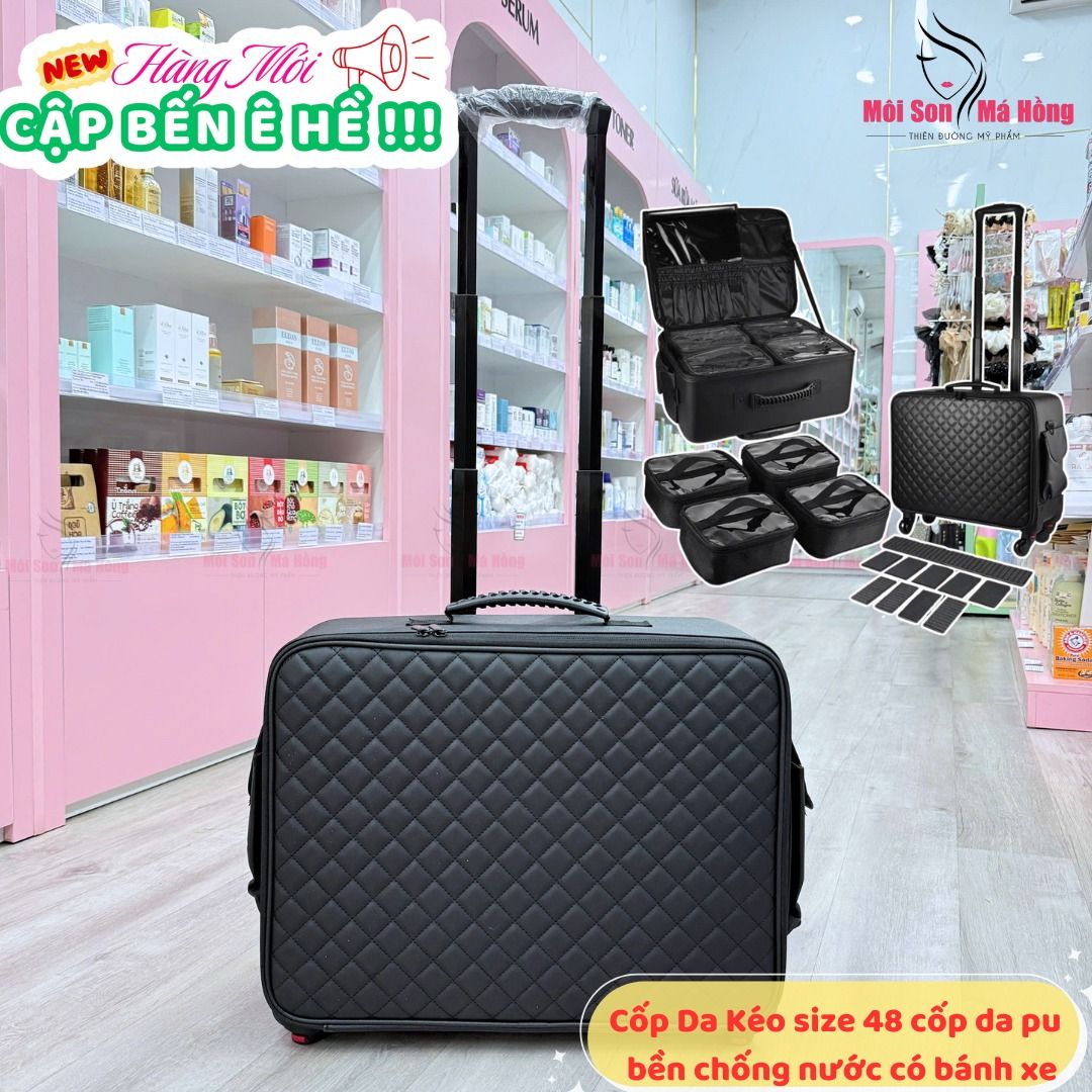 - Cốp da kéo thiết kế dưới dạng một chiếc vali có tay nắm + 4 bánh xe và khoác lên mình chất liệu dày dặn, có độ bền cao. Bên trong vali make up chuyên nghiệp này gồm có nhiều ô được ngăn cách và phân chia linh động, ngăn đựng cọ, các khay mỹ phẩm tách rời; thêm 4 túi nhỏ bên ngoài để bạn thoải mái chứa đựng và sắp xếp dụng cụ, mỹ phẩm trang điểm; phục vụ cho quá trình tác nghiệp của mình đạt hiệu quả cao.