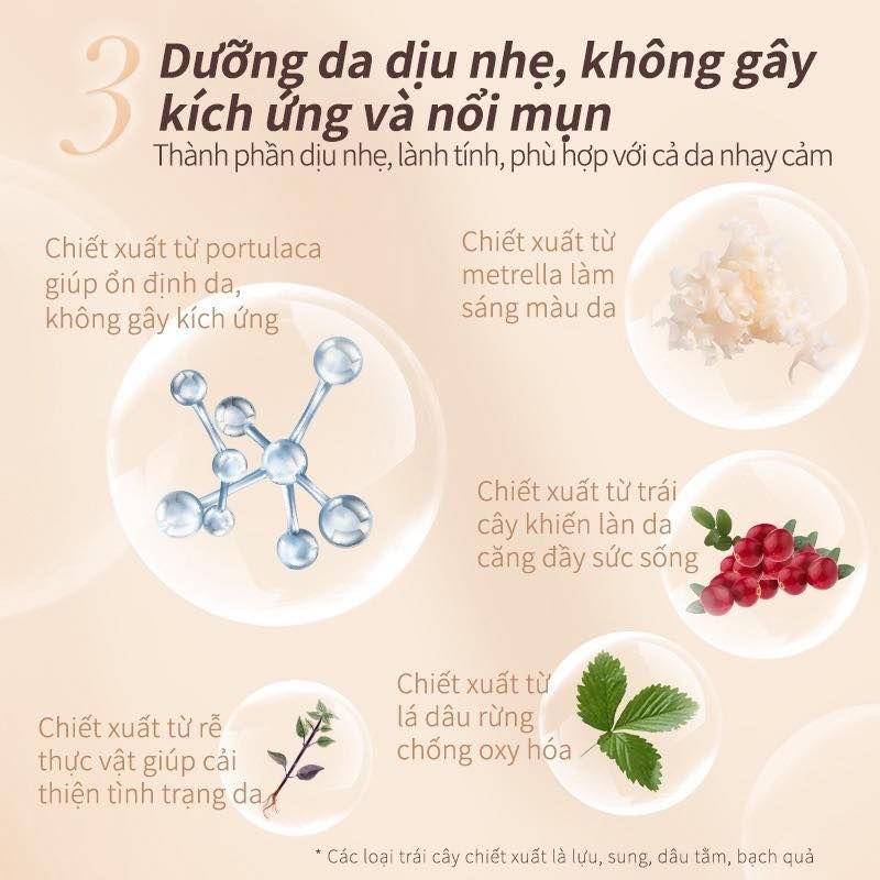 Chiết xuất trái cây (Fig, Mulberry, Pomegranate, Strawberry): Làm sáng, đều màu da và tăng sức sống cho làn da xỉn màu.