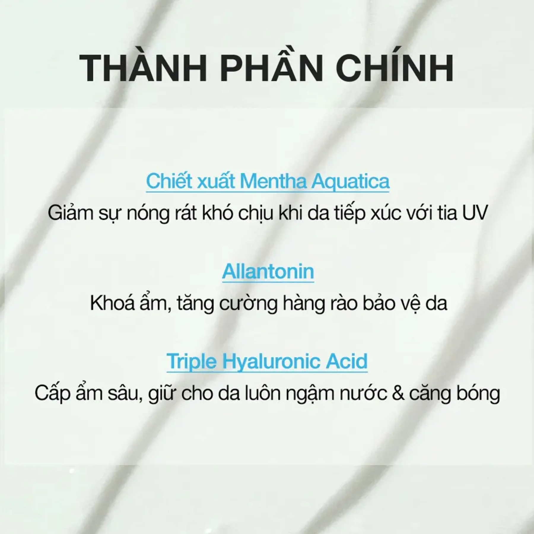 Allantoin: Khóa ẩm, tăng cường hàng rào bảo vệ da, làm giảm tác động của tia UV từ ánh nắng mặt trời