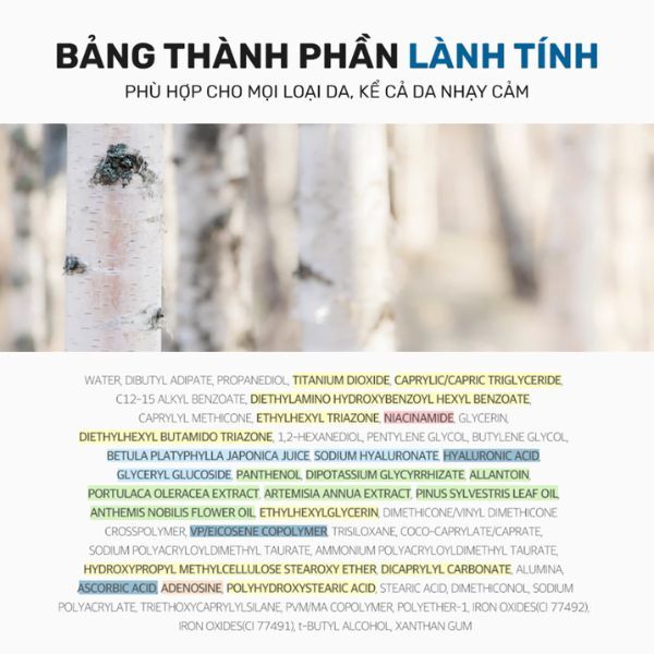 - Kem Chống Nắng Round Lab Birch Juice Moisturizing Tone-Up Sunscreen Nâng Tông Trắng Hồng với 4 màng lọc hữu cơ thế hệ mới: Uvinul A Plus, Tinosorb M, Iscotrizinol, Uvinul T 150 mang đến khả năng bảo vệ da quang phổ rộng SPF50+ PA++++, là kem chống nắng vật lí lai hóa học.