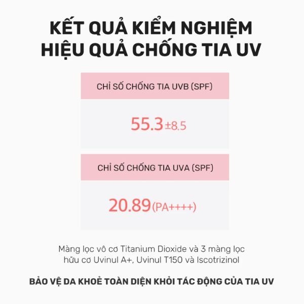 - Chất kem màu hồng, kết cấu mỏng nhẹ, thấm nhanh trên da, mang lại hiệu ứng nâng tone trắng hồng, căng bóng.