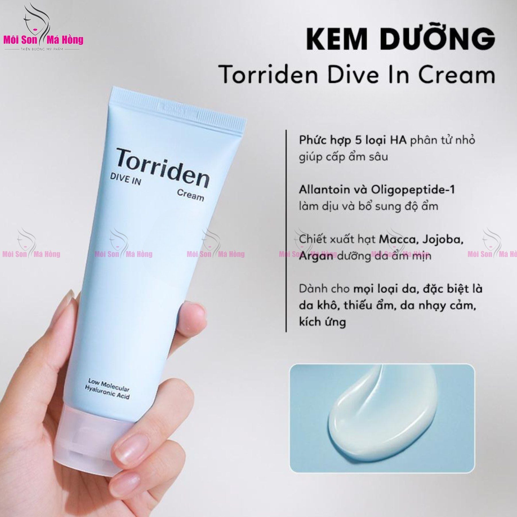 - Torriden Dive In Low Molecular Hyaluronic Acid Cream chứa 5 loại Hyaluronic Acid phân tử thấp 5D Complex (Sodium Hyaluronate, Hydrolyzed Hyaluronic Acid, Sodium Acetylated Hyaluronate, Sodium Hyaluronate Crosspolymer, Hydrolyzed Sodium Hyaluronate) đảm bảo thấm sâu vào tầng trung bì và hạ bì, hạn chế tình trạng khô mốc hay đổ dầu quá nhiều, giúp làm dịu da, cấp ẩm tức thì và tạo màng khoá ẩm bảo vệ da.