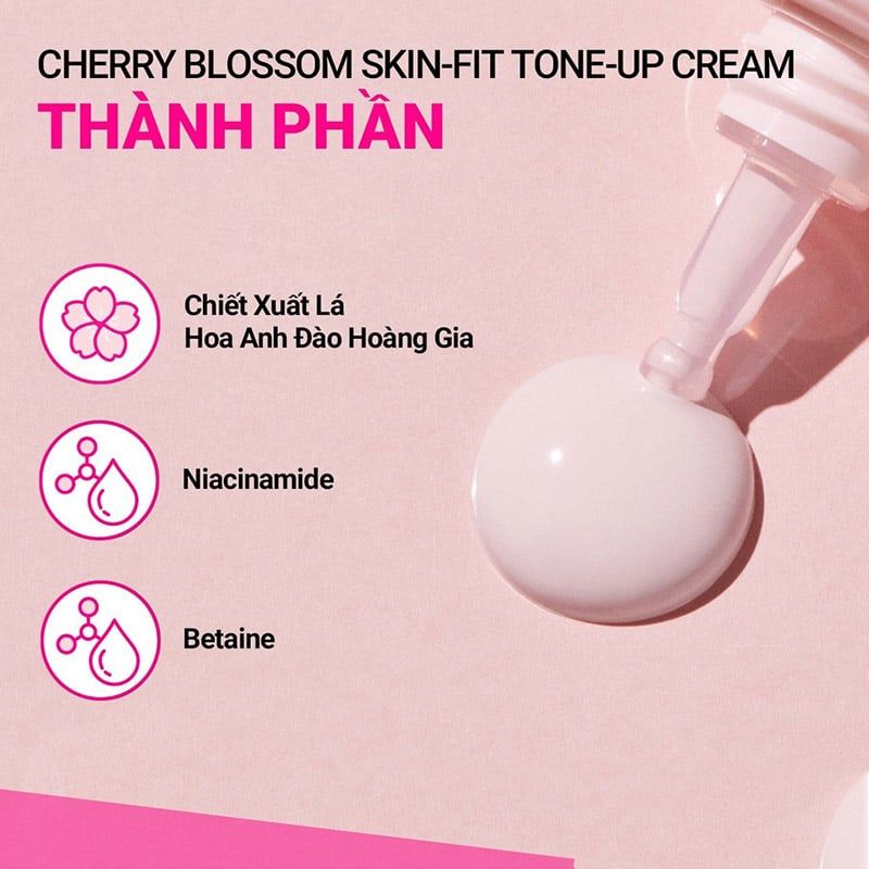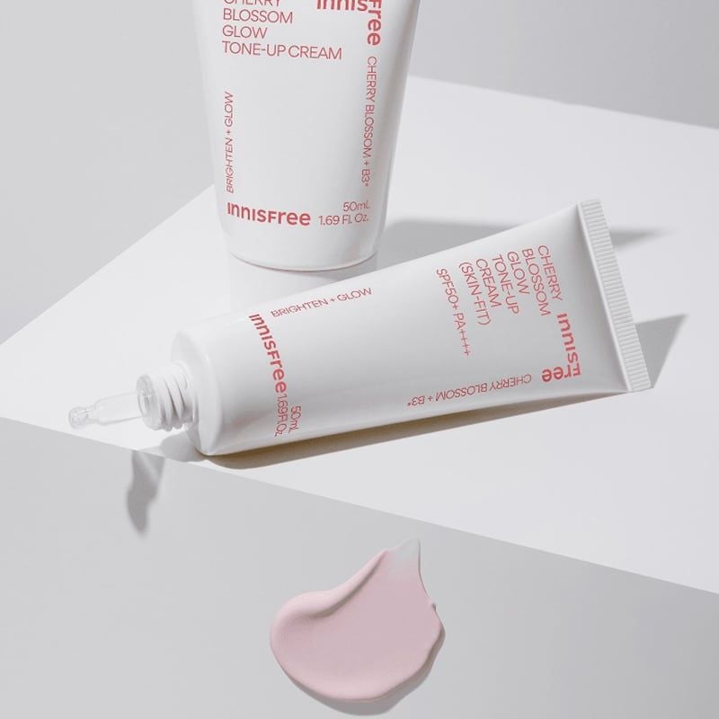 Kem Dưỡng Ẩm Nâng Tông, Làm Sáng, Chống Nắng Cho Da Innisfree Cherry Blossom Glow Skin-Fit Tone-up Cream SPF50+ là kem dưỡng thuộc thương hiệu Innisfree với kết cấu mỏng nhẹ cùng công thức từ cánh hoa anh đào giúp nâng tông da nhẹ nhàng tức thì, hỗ trợ dưỡng ẩm, làm sáng và chống nắng cho da mang đến làn da sáng mịn tự nhiên.