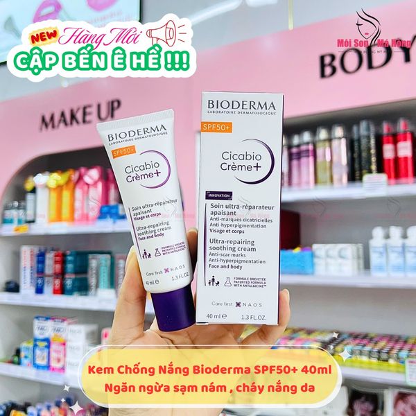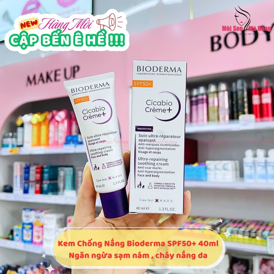 Kem dưỡng Bioderma Cicabio SPF50+ Soothing Repairing với công thức chứa màng lọc chống nắng, giúp dưỡng da, làm dịu da, phục hồi nhanh chóng và ngăn ngừa sự hình thành sẹo và thâm.