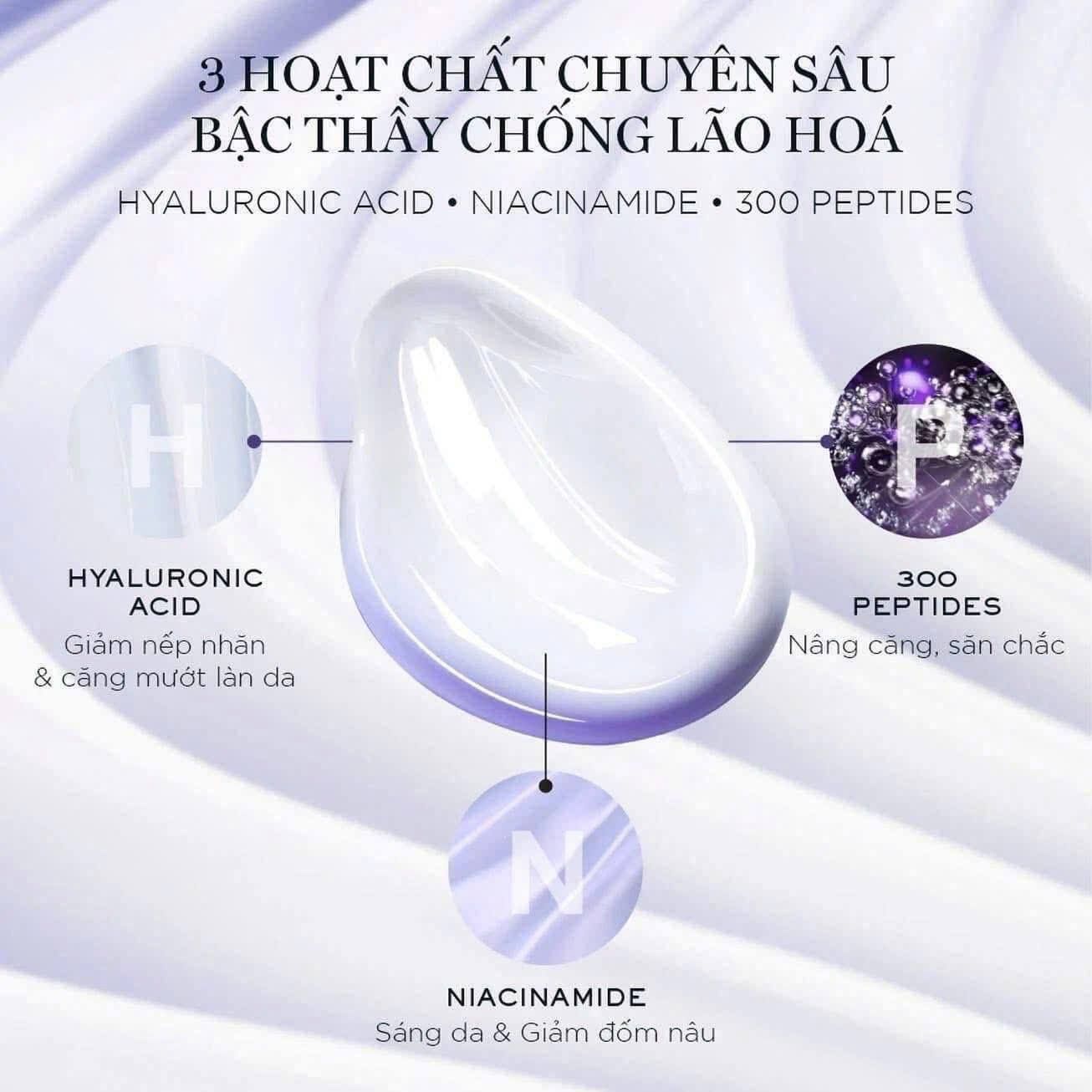 Công thức độc quyền với sự kết hợp 3 thành phần dưỡng da hàng đầu trong một loại kem dưỡng duy nhất bao gồm Hyaluronic Acid, sức mạnh 300 loại Peptides và Niacinamide.