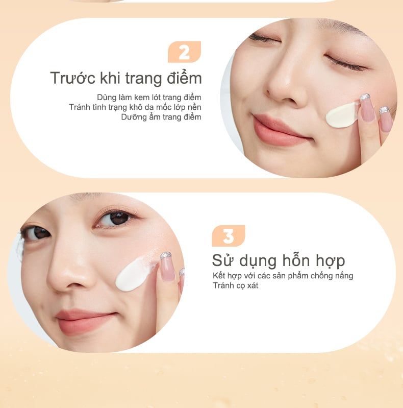 Lấy một lượng kem vừa đủ, chấm lên 5 điểm trên khuôn mặt (trán, mũi, 2 má, cằm). Dùng tay hoặc bông mút tán đều khắp mặt. Tiếp tục các bước trang điểm khác như kem nền, phấn phủ.