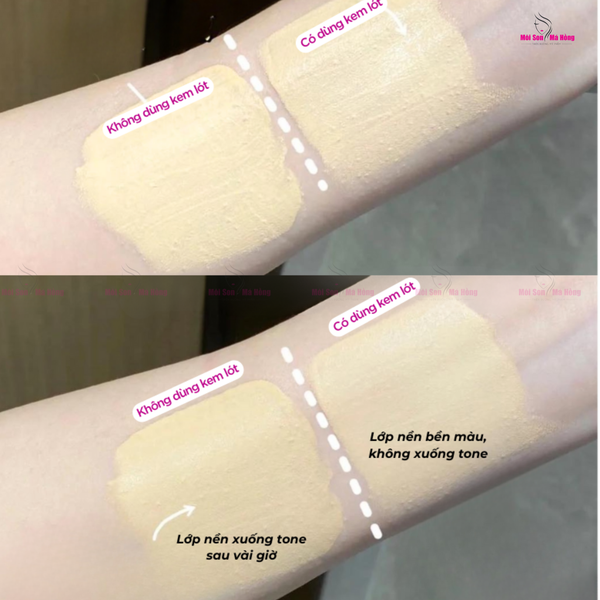 - Kem lót kiềm dầu giúp loại bỏ tình trạng lớp nền bị lem và xuống màu theo thời gian. Khi kết hợp kem lót nâng tone và kem nền, bạn nên giảm lượng kem nền để da không bị nặng nề, đảm bảo độ che phủ cao tối đa.