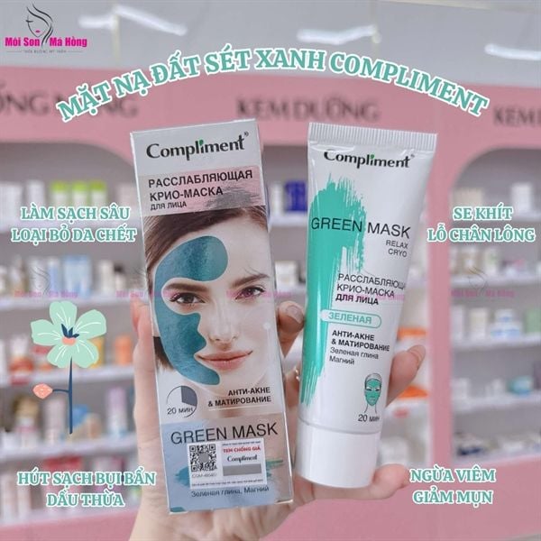 - Mặt Nạ Đất Sét Làm Sạch Sâu Giảm Mụn Se Lỗ Chân Lông Compliment No Problem Green Face Mask giúp hút bã nhờn, bụi bẩn và tạp chất từ lỗ chân lông, giúp da trở nên sạch sẽ và tươi mới; giúp loại bỏ tế bào chết trên da, làm đều màu da và làm mờ vết thâm mụn; giúp kiểm soát và giảm mụn, đặc biệt là mụn đầu đen; giúp se khít lỗ chân lông sau khi làm sạch, giúp ngăn chặn bụi bẩn và dầu tiếp tục tích tụ trong lỗ chân lông, giúp da mịn màng hơn; giúp tăng cường độ đàn hồi cho da.