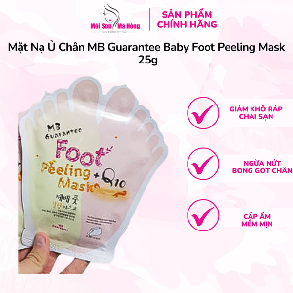 Mặt nạ ủ chân MB Guarantee Baby Foot Peeling Mask 25g được chiết xuất từ thành 17 loại trái cây, cung cấp rất nhiều vitamin giúp loại bỏ tế bào chết, đồng thời kích thích tái tạo làn da mới trắng mịn hơn. Sản phẩm còn có những thành phần tự nhiên chứ AHA, BHA, Hyaluronic Acid Gelatin giúp làm mềm những vùng chai sạn, thô ráp lâu ngày. Các thành phần này sẽ thẩm thấu sâu vào bên trong tế bào chết, phá huy liên kết bền vững giữa chúng và kích hoạt quá trình bong tróc như một cơ chế tự nhiên của làn da.