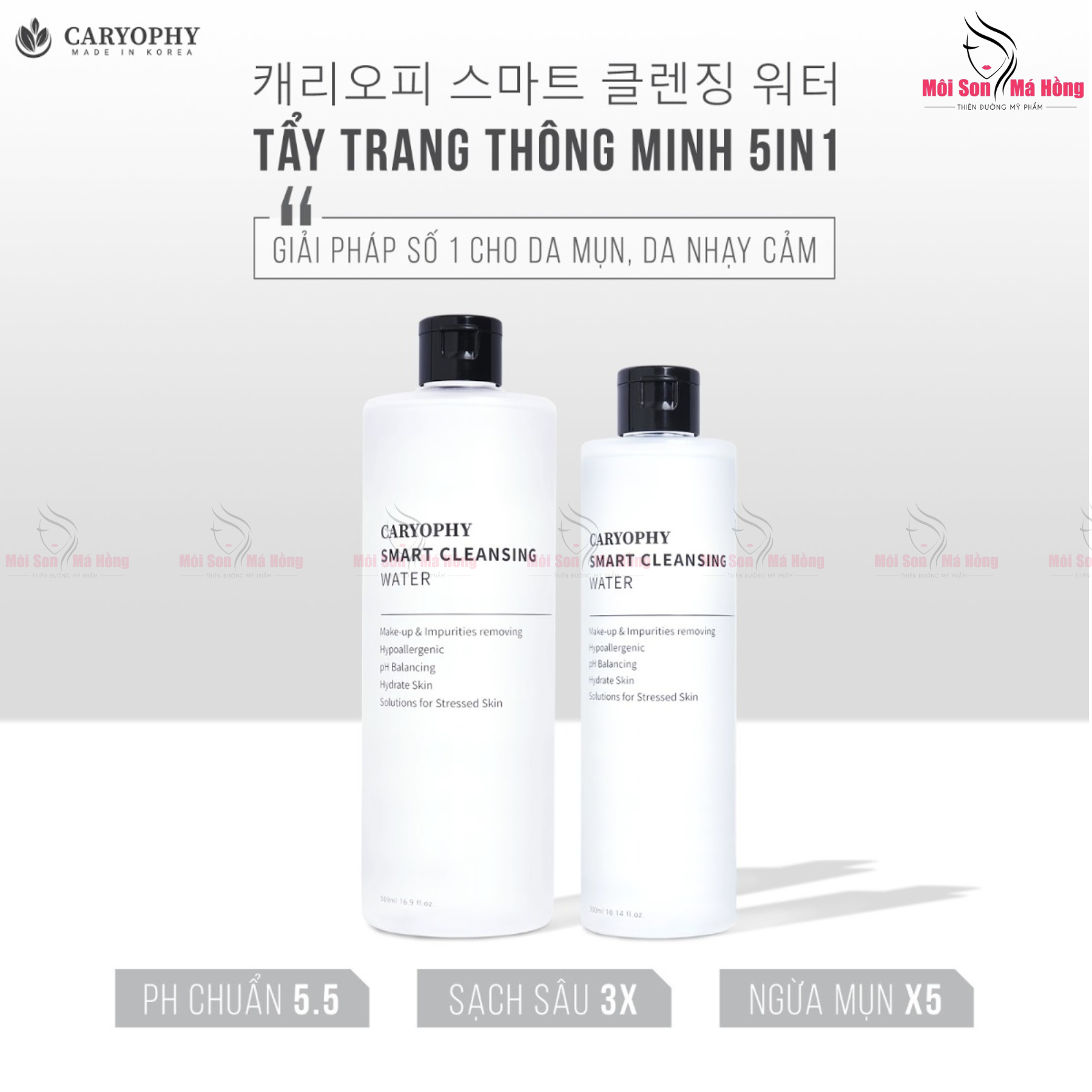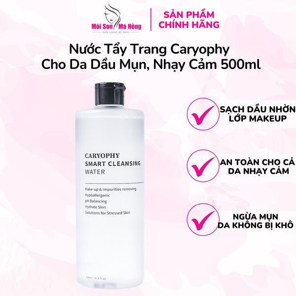 - Nước Tẩy Trang Làm Dịu Dành Cho Da Dầu Mụn Caryophy Smart Cleansing Water là nước tẩy trang sử dụng công nghệ tiên tiến AQUA TECA giúp loại bỏ sạch lớp trang điểm, dầu nhờn trong lỗ chân lông một cách hoàn hảo.