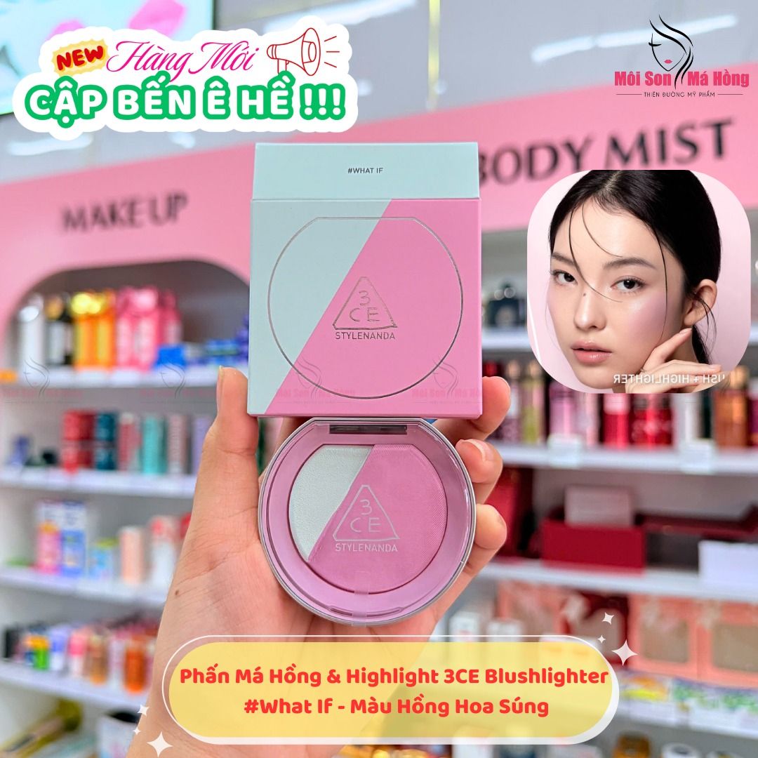 Phấn má hồng bắt sáng 3CE Blushlighter là dòng má hồng kết hợp highlight đến từ thương hiệu Hàn Quốc 3CE, mang đến hiệu ứng ửng hồng rạng rỡ cùng ánh nhũ nhẹ nhàng giúp khuôn mặt bừng sáng tự nhiên. Với chất phấn mịn mượt, dễ tán và không gây bết dính, sản phẩm tạo lớp finish mỏng nhẹ như da thật, giúp làn da trông đều màu và tươi tắn hơn. Nhờ công thức pha trộn thông minh giữa phấn lì và phấn bắt sáng, 3CE Blushlighter giúp định hình gương mặt, đồng thời tạo chiều sâu cuốn hút, phù hợp với nhiều phong cách trang điểm.