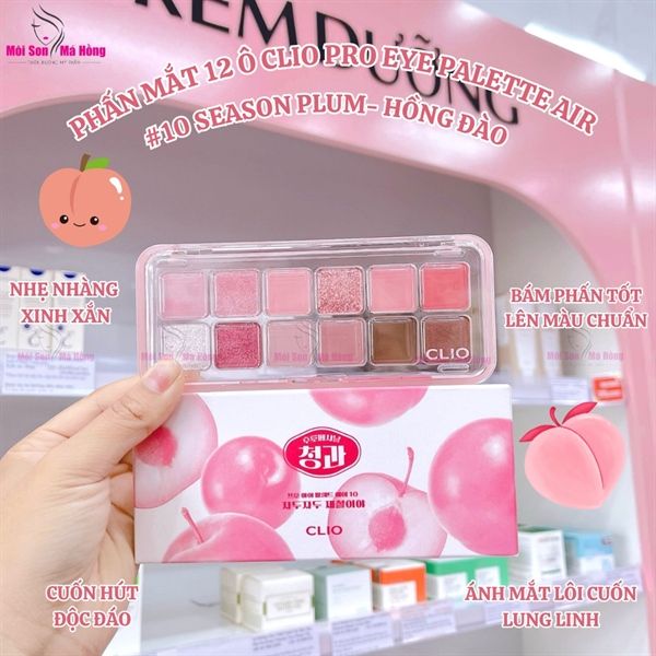 - Bảng Phấn Mắt 12 Ô Clio Pro Eye Palette Every Fruit Grocery Collection là phiên bản mới được nhà Clio cho ra mắt vào mùa xuân năm nay với thiết kế xinh xắn cùng 12 tone màu đa dạng từ những màu trơn đến ánh nhũ lấp lánh, có thể phối hợp nhiều lối makeup khác nhau.