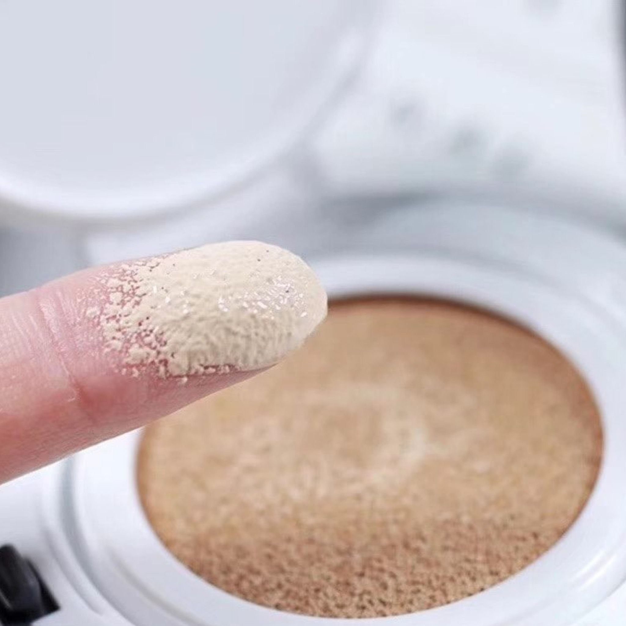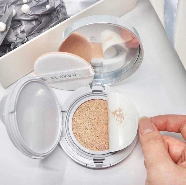 Sau bước dưỡng da, dùng bông phấn lấy một lượng vừa đủ sản phẩm Phấn Nước Klavuu Urban Pearlsation High Coverage Tension. Tán đều lên mặt, kể cả vùng cổ để có một lớp nền đẹp hoàn hảo.