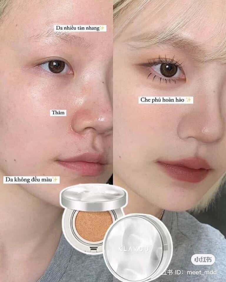 Phấn Nước Klavuu có kết cấu dạng lỏng, mỏng nhẹ, có khả năng che phủ cao và độ thẩm thấu nhanh. Chất phấn có cấu tạo gồm 3 phân tử có kích thước khác nhau, tạo ra lớp màng che phủ vững chắc lên da. Công thức cải tiến giúp lớp nền đẹp hoàn hảo, không lem, không trôi suốt cả ngày dài. Khi apply lên da, cho lớp finish mịn lì, không bị bóng dầu, nâng tông nhẹ nhàng, cho hiệu ứng glowy chuẩn đẹp tự nhiên, không gây nhờn rít hay làm bít tắc lỗ chân lông. Sản phẩm có khả năng chống nắng hiệu quả với chỉ số chống nắng lên đến SPF50+/PA+++, bảo vệ da trước tác hại của tia UV từ ánh nắng mặt trời.