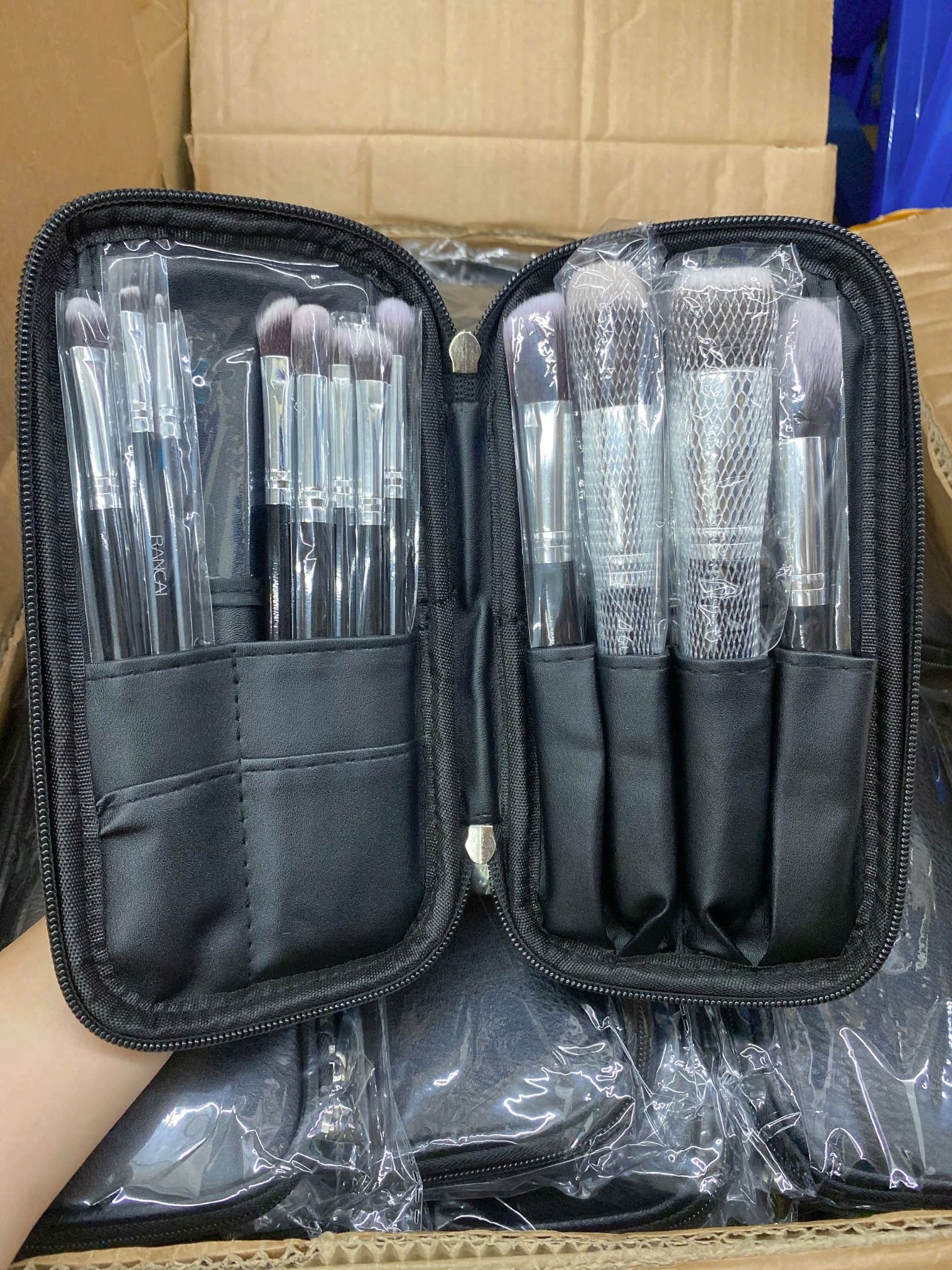 RANCAI Bộ Cọ Trang Điểm 12 Cây Màu Đen Kèm #Cán Bạc - Bao Da Vuông