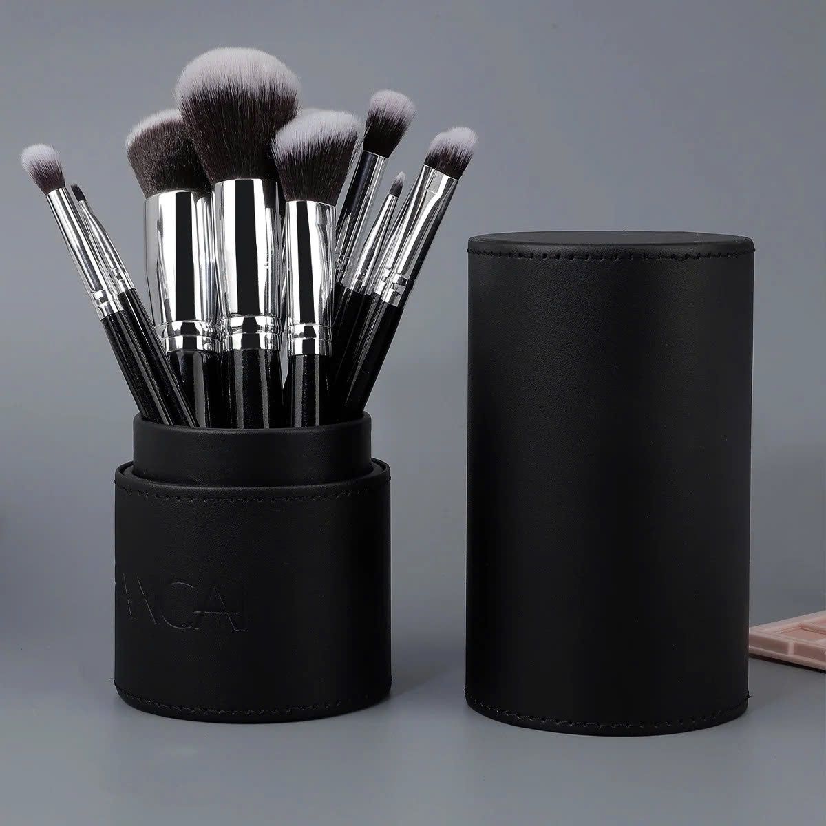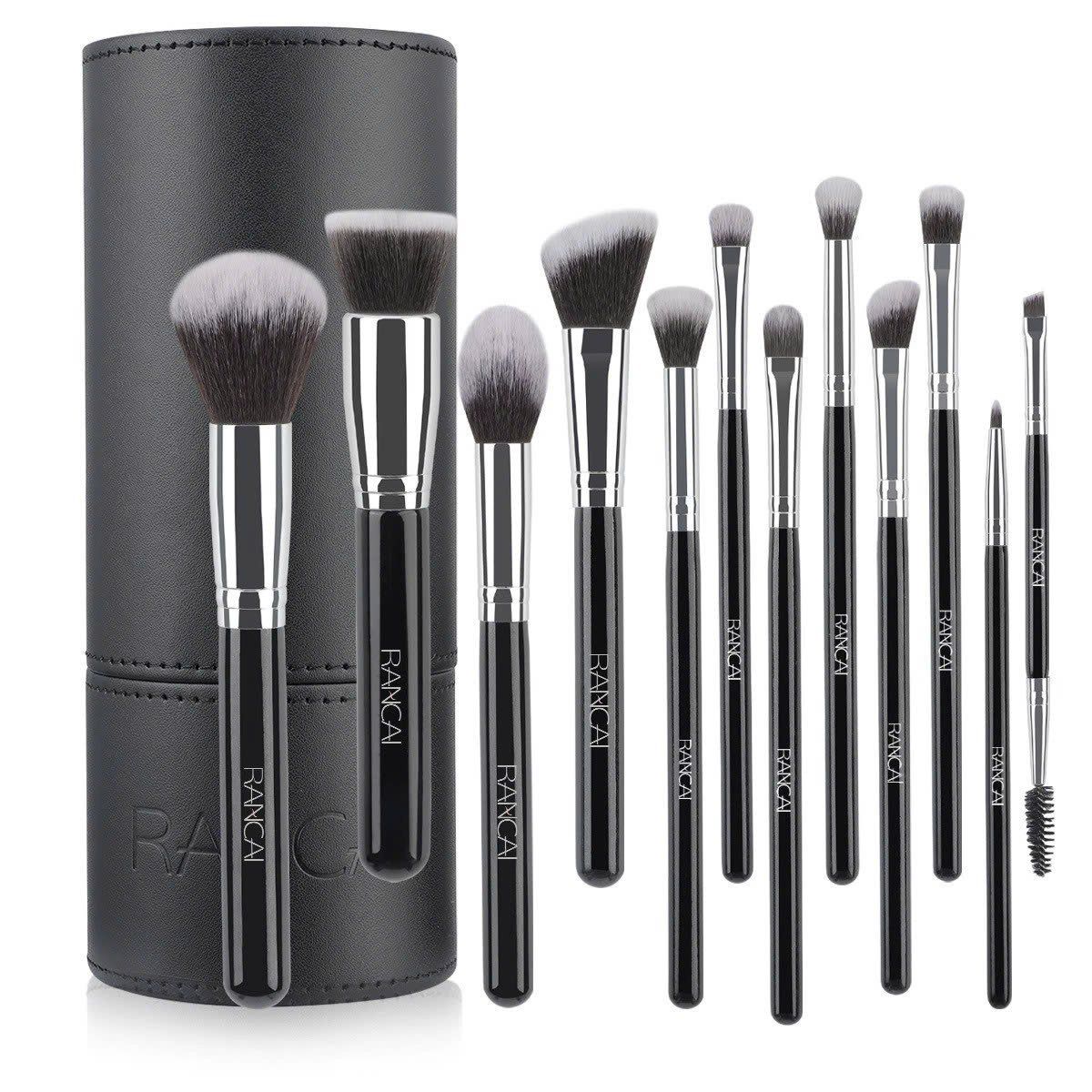 RANCAI Bộ Cọ Trang Điểm 12 Cây Màu Đen Kèm #Cán Bạc - Hộp Da tròn