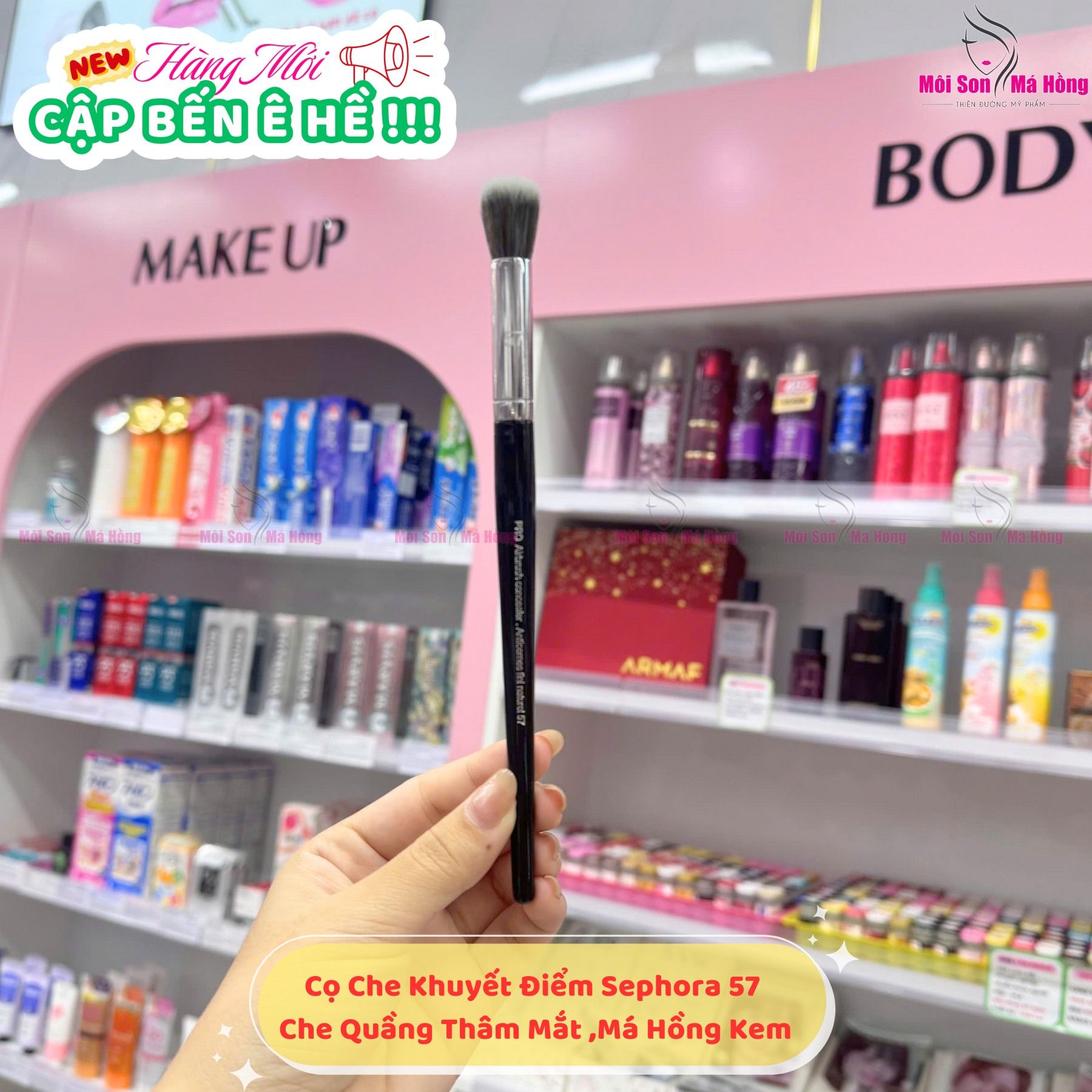 Cọ che khuyết điểm Sephora 57 với thiết kế không khác gì một cọ nền dạng buffing thu nhỏ, giúp cho lớp kem che khuyết điểm được blend đều cho vùng da dưới mắt, dàn trải lớp kem che khuyết điểm giúp cho đôi mắt bừng sáng hơn. Ngoài công dụng che khuyết điểm dưới mắt thì cọ Sephora 57 còn có thể che phủ tốt các vùng da không đều màu do mụn, tàn nhan hoặc khu vực da tối màu quanh miệng và hai bên cánh mũi.