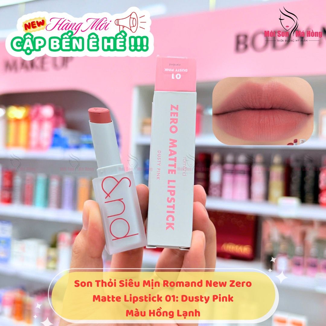 Son Romand Dusty Pink là sắc hồng đất mở đầu cho bảng màu dòng Zero Gram Matte Lipstick. Màu son nhẹ nhàng và xinh xắn, với sự cân đối hài hoà của hồng và nâu đất. Khi thoa lên môi sẽ ửng nhẹ, tự nhiên và thu hút.
