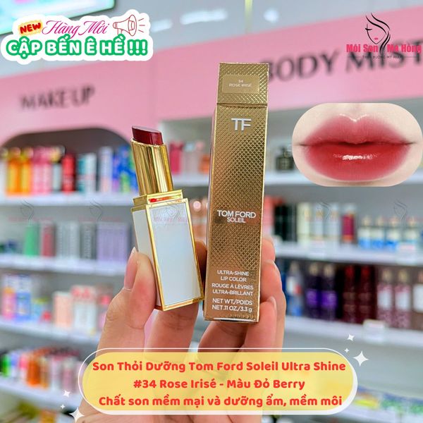 Son Tom Ford Ultra Shine Lip Color 34 Rose Irise (Màu Đỏ Berry) là tông màu đậm đà, tạo nên vẻ đẹp bí ẩn và quyến rũ, mang đến cho đôi môi sự lôi cuốn mạnh mẽ, thu hút mọi ánh nhìn. Son Tom Ford Ultra Shine Lip Color là một loại son môi nhẹ, có độ bóng cao, có sắc tố đậm đặc, thể hiện phong cách giản dị và sự sang trọng - Lấy cảm hứng từ những sắc màu gợi nhớ đến những điểm đến mang tính biểu tượng, thoát ly thực tại. Son Tom Ford Ultra Shine Lip Color có công thức cải tiến và kết hợp giữa sự dễ thoa của son môi, độ bóng của son bóng và chất làm mềm phong phú của son dưỡng