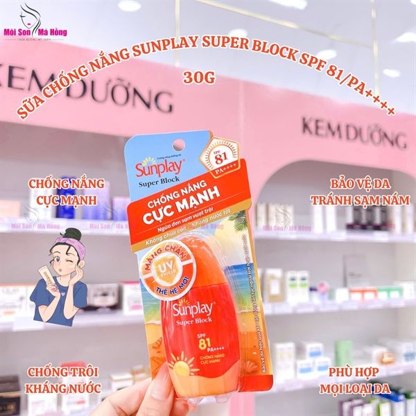 Sữa chống nắng Sunplay có kết cấu dạng sữa, thẩm thấu nhanh vào da, không gây bết dính, không làm bít tắc lỗ chân lông, không để lại vệt trắng trên da. Sản phẩm có khả năng kháng nước tốt, giúp giữ lớp chống nắng bền bỉ, lâu trôi, bảo vệ da hoàn hảo suốt cả ngày dài. Sunplay Super Block chứa các thành phần lành tính, an toàn cho da, không gây kích ứng, phù hợp với mọi loại da.